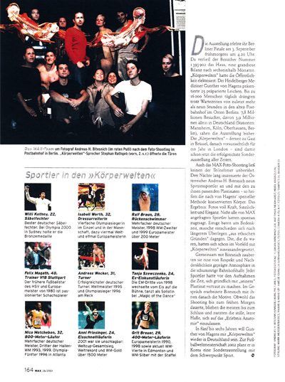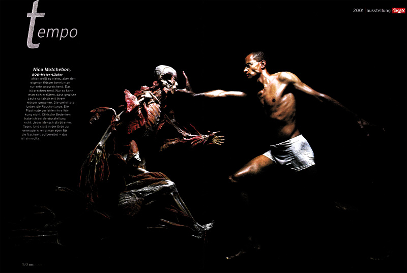 erschienen in "Max"Vier Millionen Menschen haben sie gesehen. Einige waren schockiert, viele begeistert, unberührt blieb keiner. Körperwelten war die Ausstellung des Jahres. MAX bat neun Spitzensportler zum Foto-Shooting mit den konservierten Leichten.