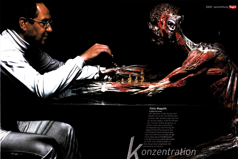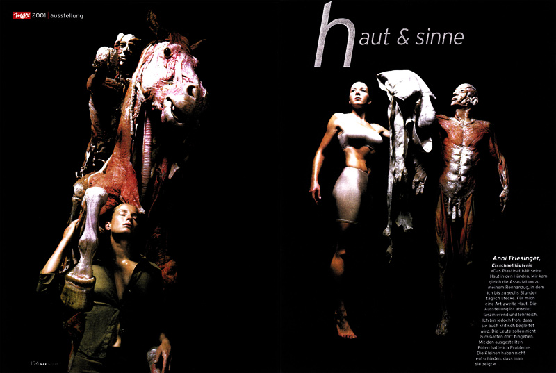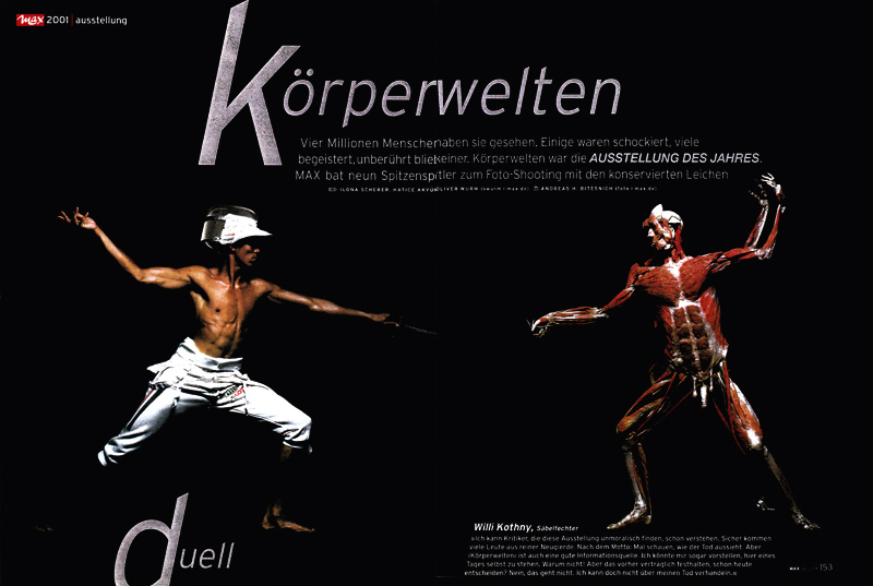 erschienen in "Max"Vier Millionen Menschen haben sie gesehen. Einige waren schockiert, viele begeistert, unberührt blieb keiner. Körperwelten war die Ausstellung des Jahres. MAX bat neun Spitzensportler zum Foto-Shooting mit den konservierten Leichten.