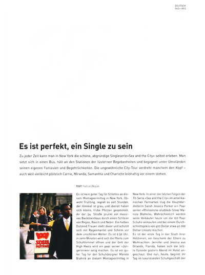 erschienen in "Deutsch Magazin"Zu jeder Zeit kann man in New York die schöne, abgründige Singleserie „Sex and the City“ selbst erleben. Man setzt sich in einen Bus, hält an den Stationen der lüsternen Begebenheiten und begegnet unter Umständen seinen eigenen Fantasien und Begehrlichkeiten. Die ungewöhnliche City-Tour verdreht manchem den Kopf - auch weil vielleicht plötzlich Carrie, Miranda, Samantha und Charlotte leibhaftig vor einem stehen.